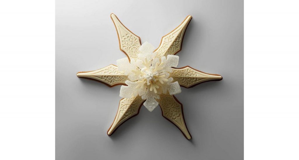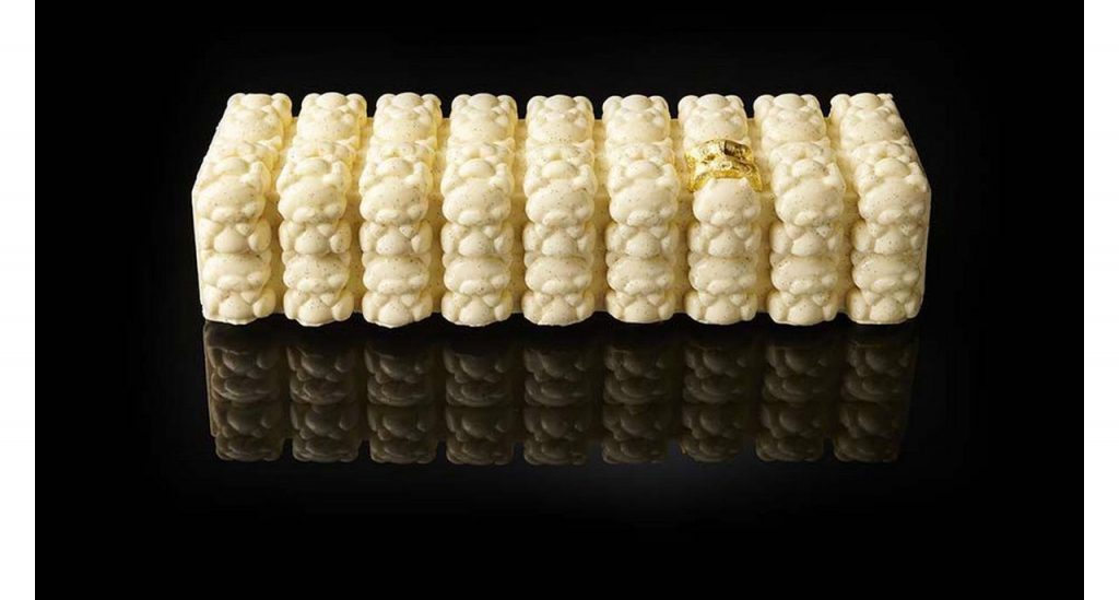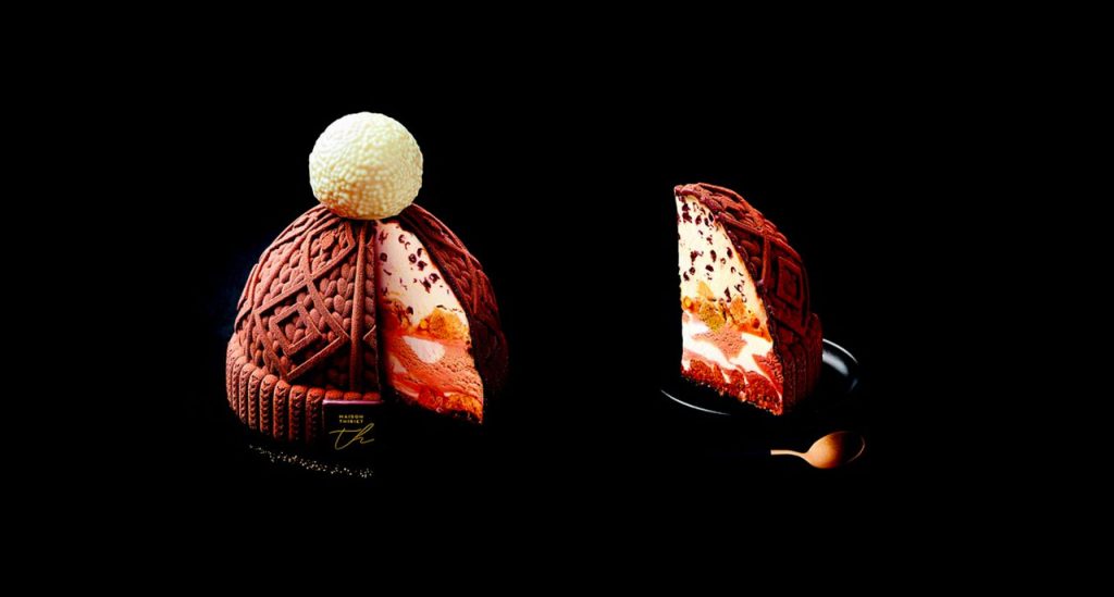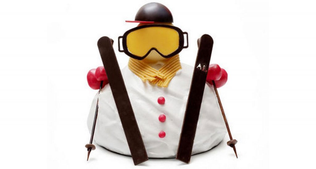Un skieur prêt pour la descente sur les pentes enneigées de la gourmandise. Sa composition révèle une dacquoise coco, crème mangue-passion aux morceaux de mangue et mousse ivoire au chocolat blanc, le tout recouvert de meringue. Une création savoureuse signée par le MOF Arnaud Larher. est une sculpture à déguster ! (58 euros)