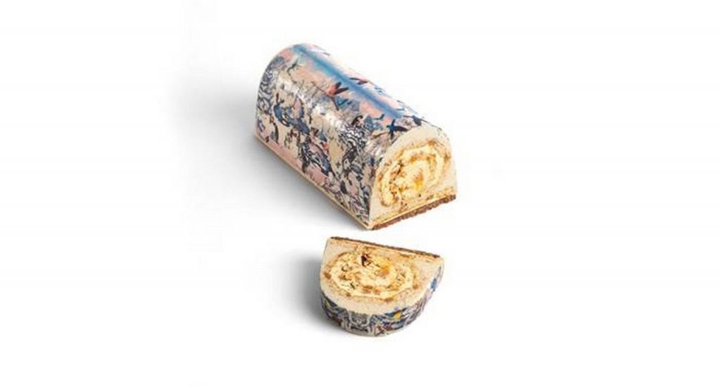 Avant de déguster cette bûche généreuse, on hume le palet en céramique finement parfumé à la fleur d’oranger. Composée d’un biscuit roulé macaron noisette délicatement imbibé d’eau de fleur d’oranger et garni à la crème à la vanille Madagascar. Quelques zestes d’orange pour le côté peps et rafraîchissant. (52 euros)