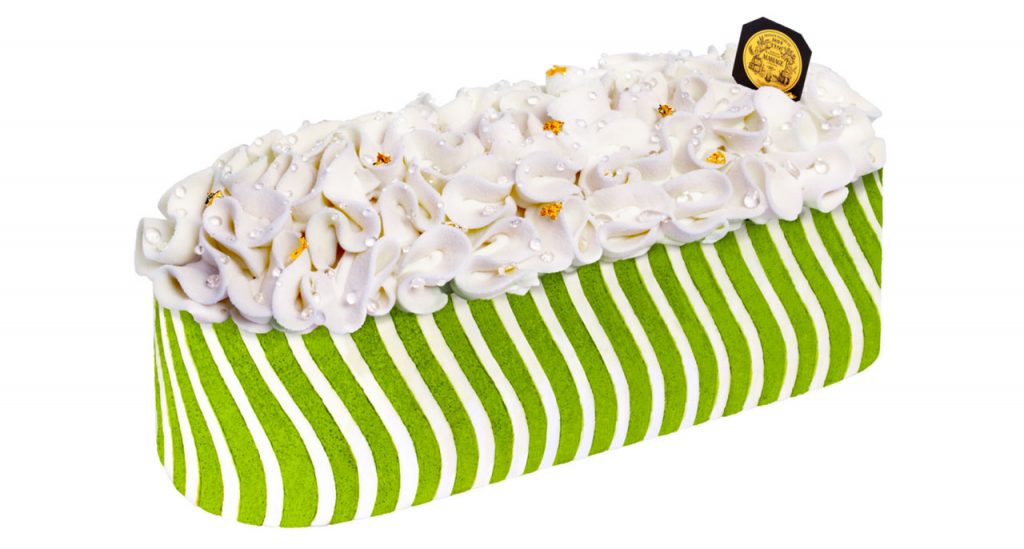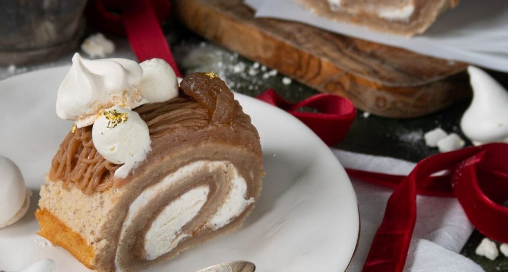 Cette bûche haute en couleur marie la fraîcheur du yuzu à la douceur d’une crème de marrons glacée parfumée au thé Noël Princier. Une ganache au thé vert Matcha de Kyoto danse sur les notes fusantes d’un confit au citron vert, posé sur un croustillant parsemé de noix de pécan caramelisées.et de crème à la vanille. (59 euros)