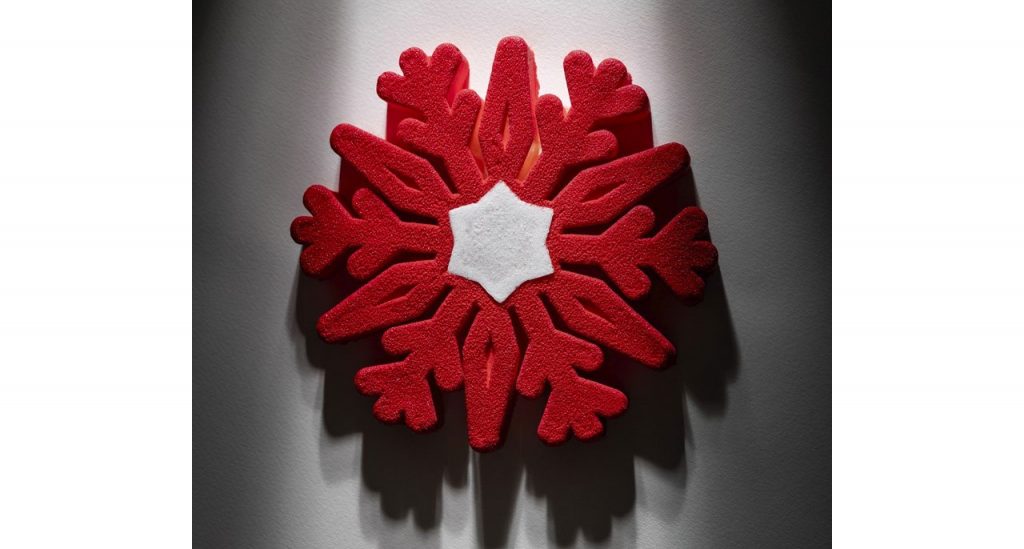 La bûche est composée d’un biscuit au miel de sylla et bergamote, d’un croustillant praliné aux amandes, avec des morceaux de cédrat confit. Le crémeux à la bergamote et la mousse d’amande complètent cette création raffinée. Paré d’un manteau rouge, le flocon de neige représente la parfaite harmonie pour les fêtes. (85 euros)