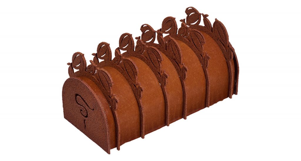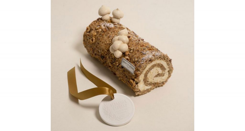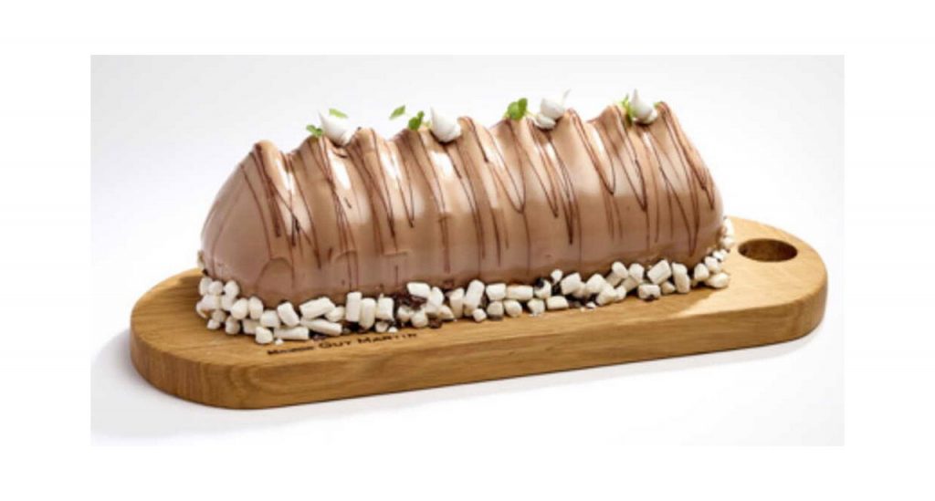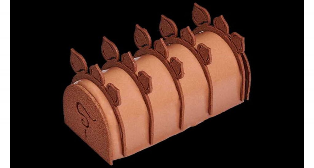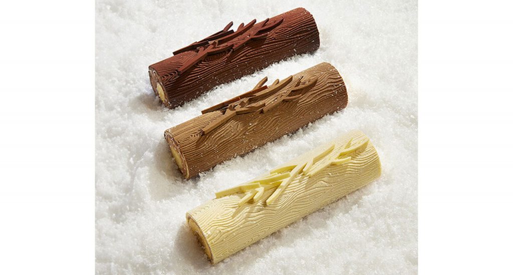 Sous le glaçage au chocolat effet bois se dissimule un savoureux biscuit Joconde, à la texture souple et aérienne. À l’intérieur, un praliné fondant se dévoile avec finesse et se mêle à une mousse praliné aux amandes et chocolat noir, associée à une crème à l’orange ou à un crémeux à la vanille de Madagascar. (55 euros)
