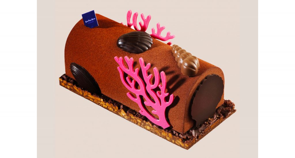 Le monde de la mer rencontre celui du chocolat…. Par la magie du MOF Jean-Paul Hévin, coquillages et coraux donneront une note poétique à votre table de Noël. Praliné croustillant noisette, biscuit pain de Gênes chocolaté, crémeux praliné, mousse chocolat noir Grand cru du Pérou, socle amandes caramélisées au chocolat au lait. (67 euros)