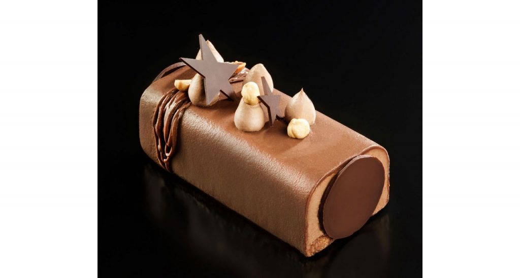 Biscuit moelleux chocolat, sabayon chocolat noir 72% de cacao, réhaussé de crème brûlée à la vanille de Madagascar et d’un confit confit orange/passion, crémeux à la noisette, croustillant sablé au praliné noisette et café. Vêtue de dentelle aussi raffinée que gourmande, l’Etoile Noire est une bûche très chocolatée. (60 euros)