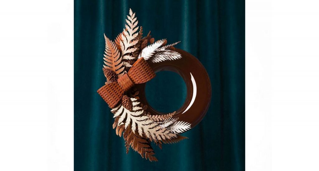Cette couronne au laqué parfait cacao cache une bûche généreuse aux parfums d’agrumes et chocolat infusé à la feuille de lime. Sous le glaçage cacao intense, se révèle une ganache chocolat réveillée par un confit d’agrumes et une crème délicate infusée à la feuille de lime sur un croustillant aux éclats de noisettes. (190 euros)