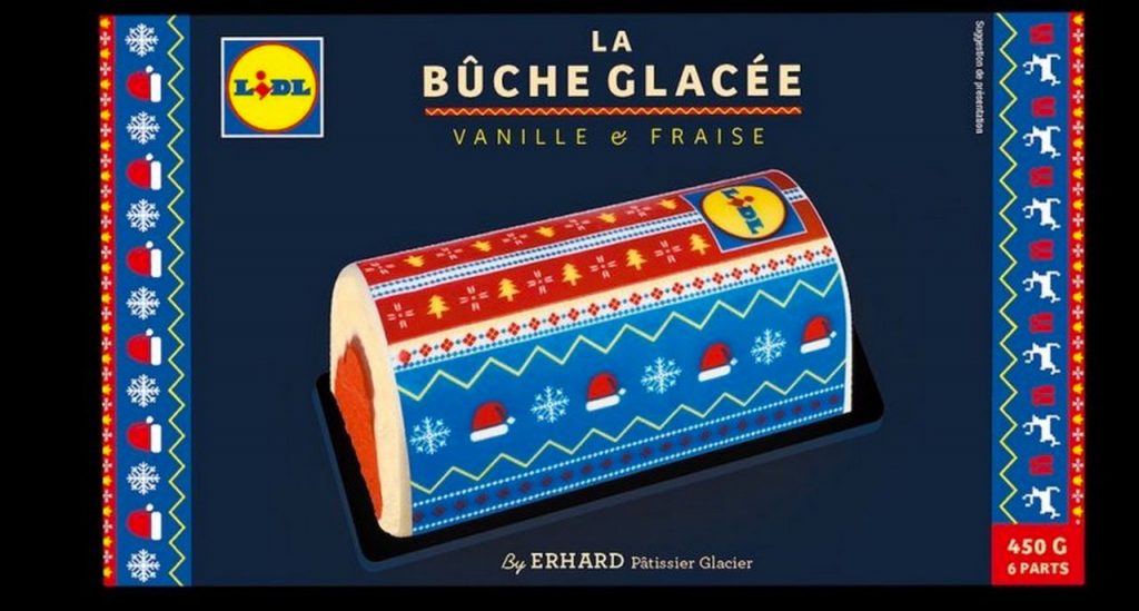 Toujours en collaboration avec l’entreprise Erhard, Lidl dévoile sa bûche glacée avec de la crème à la vanille, une sorbet fraise et une compotée de fruits rouges. Surmonté d’un joli décor hivernal se trouvent des bonnets, des flocons et des sapins. Le côté glacé de cette bûche est parfait pour terminer un repas un peu copieux. (5,99 euros)