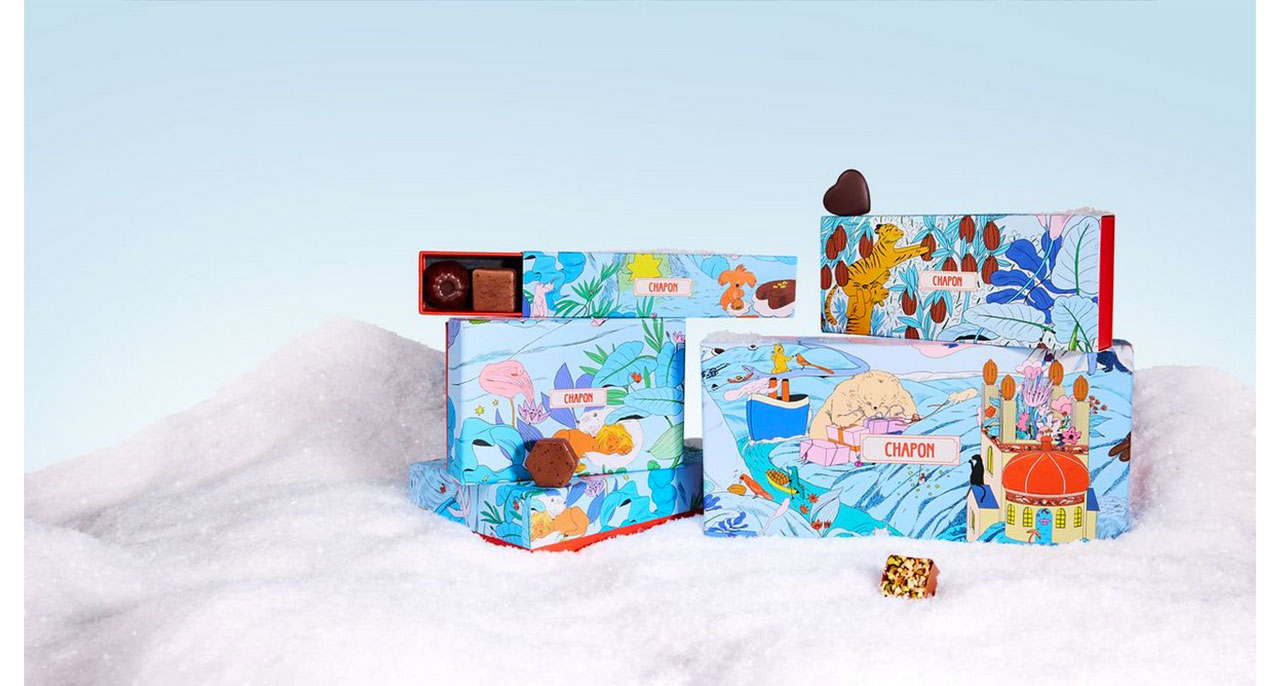 Pour Noël, la chocolaterie Chapon imagine une belle collection de coffrets qui présentent de manière ludique et poétique le savoir-faire de la Maison, de la fève et de la tablette. Joliment illustrée par Karlotta Freier. Chaque bouchée invite à un voyage au cœur des créations iconiques du chocolatier.( A partir de 6 chocolats, 14 euros)