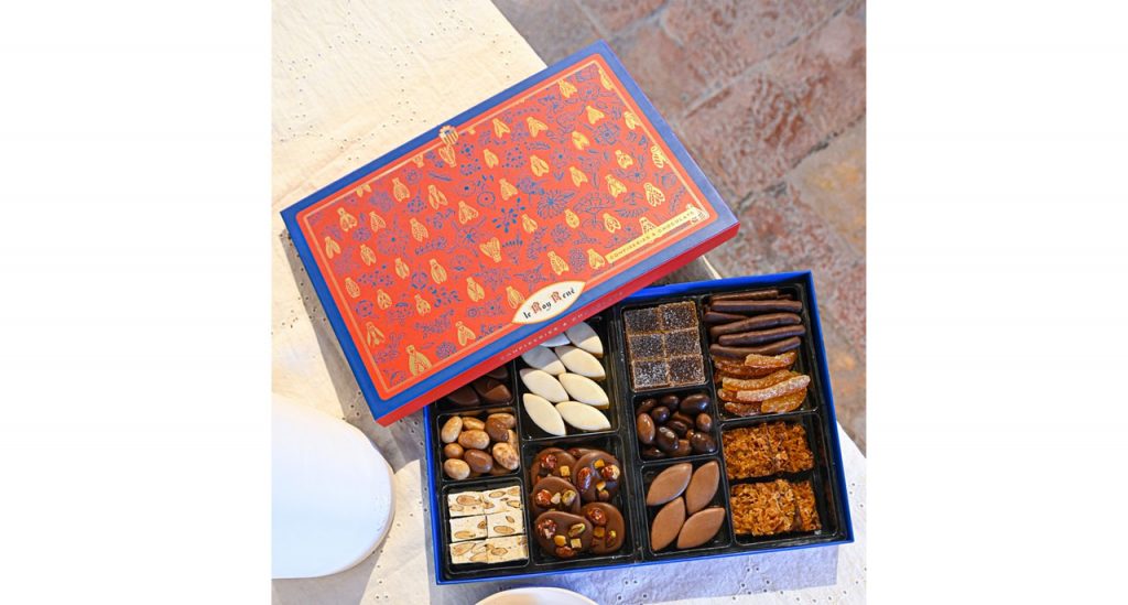 Véritable hommage aux traditions artisanales et à l’élégance festive, ce coffret mêle douceurs chocolatées et confiseries emblématiques, habillé d’une illustration raffinée où la cigale est à l’honneur. Calissons d’Aix, mendiants, orangettes, florentins, nougats, calamandes. Une symphonie de saveurs pour les épicuriens exigeants. (56,95 euros)