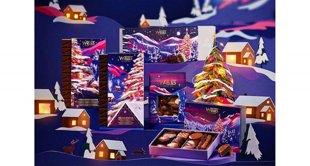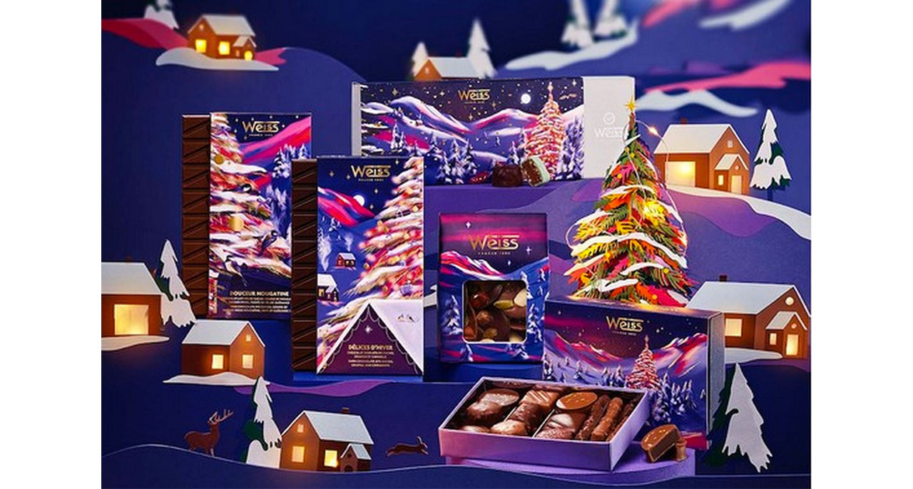 La collection « Weiss et l’arbre enchanté » est composée de six produits et nous plonge dans un univers poétique où la forêt de sapins enneigée côtoie un majestueux arbre de Noël illuminé. Illustrée par Clara Debray. Une sélection exclusive où les plaisirs sucrés se mêlent à la magie de Noël. (19,50 euros le ballotin de 110g)