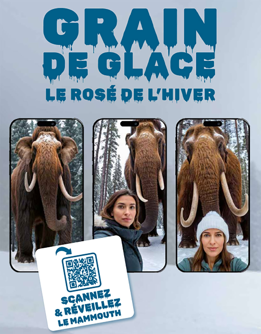 Cet hiver Grain de Glace repousse encore les limites de la créativité en devenant le premier vin à proposer une expérience en réalité augmentée. En scannant le QR Code sur la bouteille collector 2025, les amateurs voient surgir dans leur environnement le mammouth en 3D, figure totem de cette édition qui s’anime. Une expérience ludique et spectaculaire qui transforme chaque dégustation en un moment interactif et mémorable.