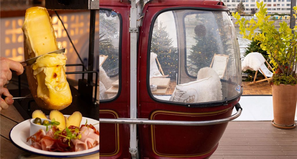 On peut aussi se retrouver chez Polpo à Levallois ! Cette péniche restaurant, nichée sur les bords de Seine parisiens, s’est associée à Moët & Chandon pour créer une station de ski urbaine pour tout l’hiver. Sapins scintillants, télécabines cosy et une piste de curling en libre accès pour tous les clients. Et pour se réchauffer, un espace bar fermé et chauffé nous accueille avec une ambiance de chalet typique. Le vendredi soir, c’est raclette party à volonté à 27,5 euros ! Fromages à raclette et pommes de terre à gogo, accompagnés d’une assiette de charcuterie, pour un plaisir gourmand presque sans limite. L’occasion rêvée de passer une soirée conviviale entre amis ! (Polpo Nord: 47 quai Charles Pasqua, 92300 Levallois-Perre)