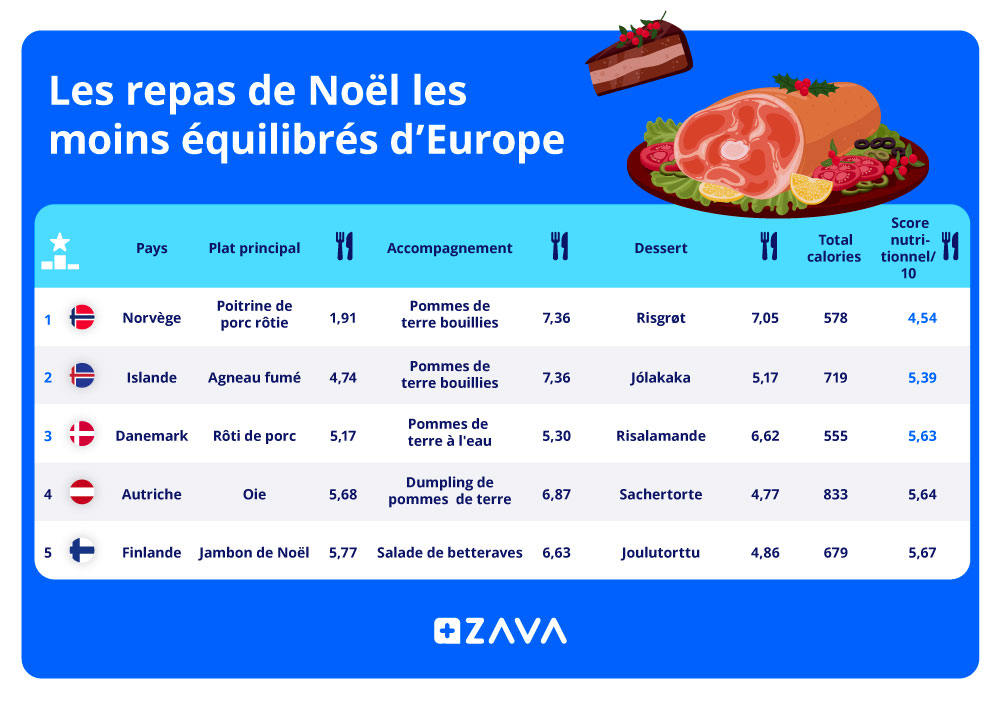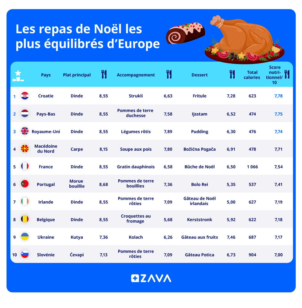 Concernant la méthodologie ZAVA a souhaité explorer les repas de Noël à travers l’Europe pour mettre en lumière les différentes traditions culinaires et identifier des pistes d’amélioration nutritionnelle. L’objectif est d’inspirer ceux qui souhaitent varier leurs menus, adopter des alternatives plus équilibrées, et profiter des fêtes sans ressentir cette sensation de « trop plein », tout en prenant soin de leur santé.