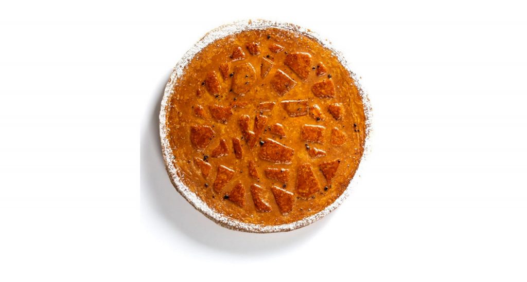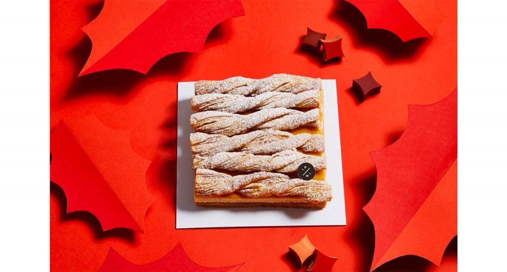 La galette signature « Escale en Orient », de la Maison dévoile un feuilletage croustillant orné de délicats grains de blé dorés. A l’intérieur une brioche imbibée d’un sirop à l’eau de fleur d’oranger, une crème frangipane parfumée à l’eau de fleur d’oranger et une compotée de dattes et d’abricot. Une dépaysement oriental ! (59 euros)
