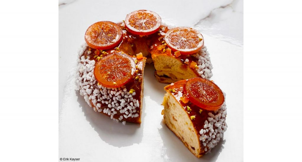 Symbole de partage et de fête, la brioche des Rois du Sud garnie de fruits confits dévoile une texture fondante et aérienne, relevée par la finesse de la.fleur d’oranger..Un nappage délicat, entouré de grains de sucre nacrés, pistaches concassées et tranches d’orange confites viennent éveiller vos papilles. Une merveille ! (29 euros)