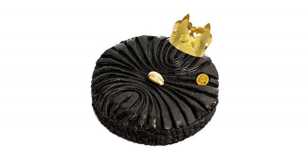 Une frangipane soyeuse ponctuée de myrtilles et de cassis confits s’est glissée sous un feuilletage noir brillant. Une dragée recouverte de feuille d’or vient illuminer le dessus de la galette, joyau offert par les Rois Mages. Laissez-vous porter par la magie envoûtante du mythique thé blanc Marco Polo Rhaspsody. Le top !(53 euros)