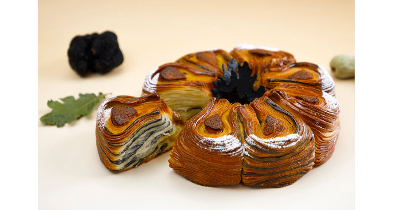 Pour cette galette des rois, l’artisan chocolatier et le spécialiste dans l’art de la truffe ont élaboré une création qui sort des sentiers battus ! Sous un feuilletage viennois pur beurre se trouve un cœur à la frangipane ultra fondante sublimée par la truffe melanosporum. Deux rencontres explosives élaborées dans les règles de l’art. (73 euros)