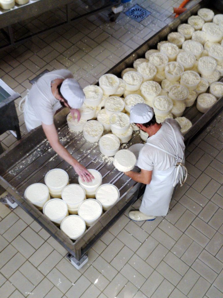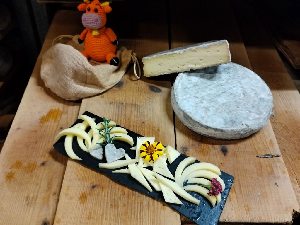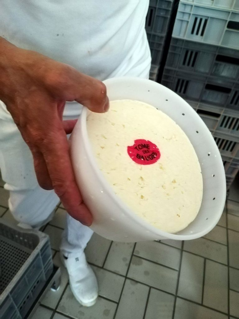 Plusieurs étapes sont nécessaires à la réalisation de la Tome des Bauges : La traite (deux fois par jour), la maturation du lait cru, l’emprésurage et la coagulation, l’égouttage, le décaillage et le brassage, le soutirage et le moulage, le salage. Et la dernière l’affinage qui dure 5 semaines minimum sur des planches en épicéa non rabotées dans des caves humides (8-14°). Ensuite les fromages sont retournés et frottés un par un pour enlever le mucor (moisissure) plusieurs fois par semaine. Un travail prenant de passionnés qui n’en demeure pas moins très satisfaisant pour le résultat final !