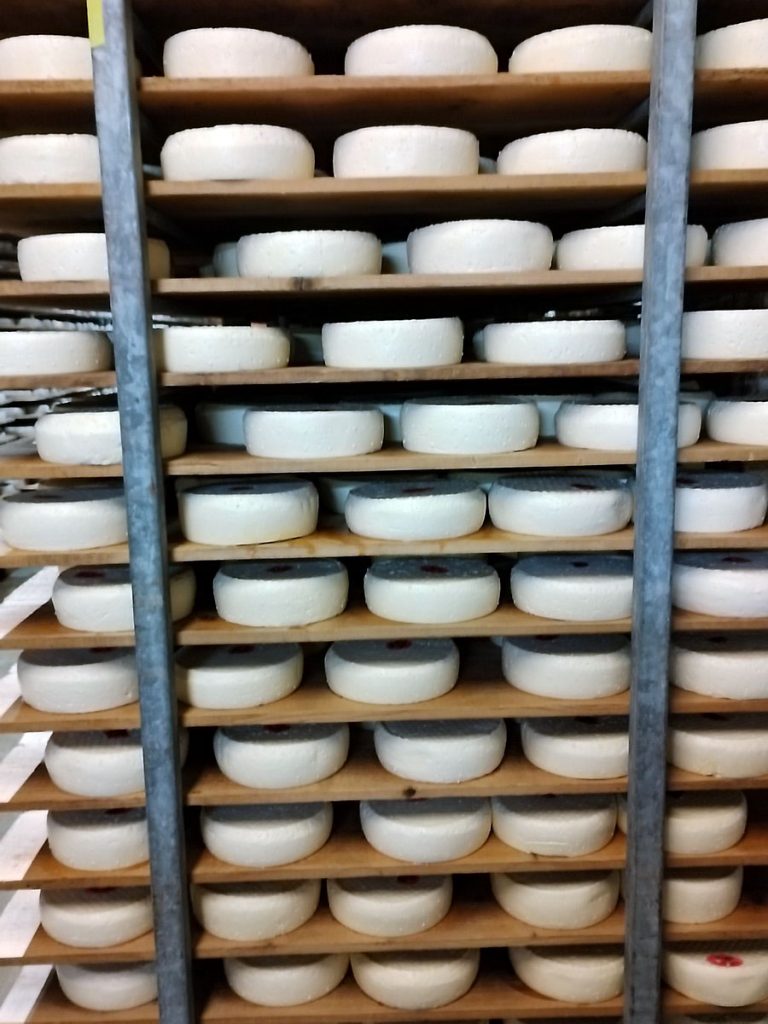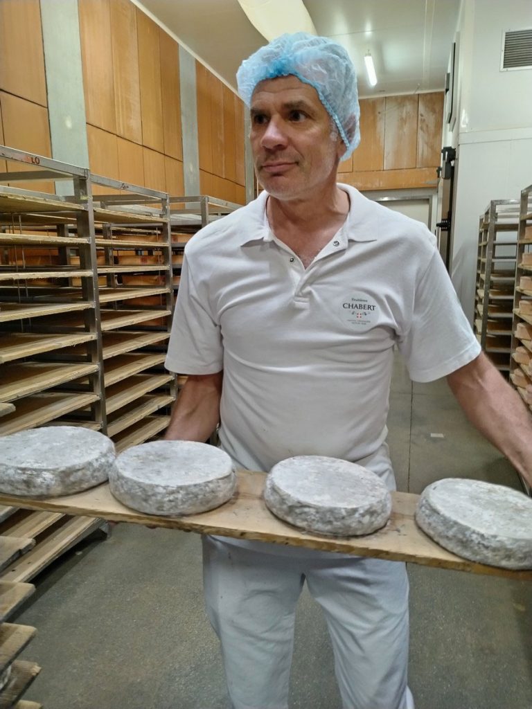 Ici rien n’est industriel, le savoir-faire des l’hommes est primordial comme l’explique Anaïs Jouan, éleveuse de 70 vaches à Glapigny. Nous sommes 57 producteurs de lait regroupés au système de coopérative « Les Fruitières », ce qui nous permet de vendre pratiquement tous nos fromages sur place. Nous sommes affectés aussi par les aléas climatiques, les canicules et les périodes de pluies intenses où les vaches produisent moins de lait. Mais on s’adapte collectivement en permanence pour le confort de nos vaches et pour garder notre philosophie de qualité.