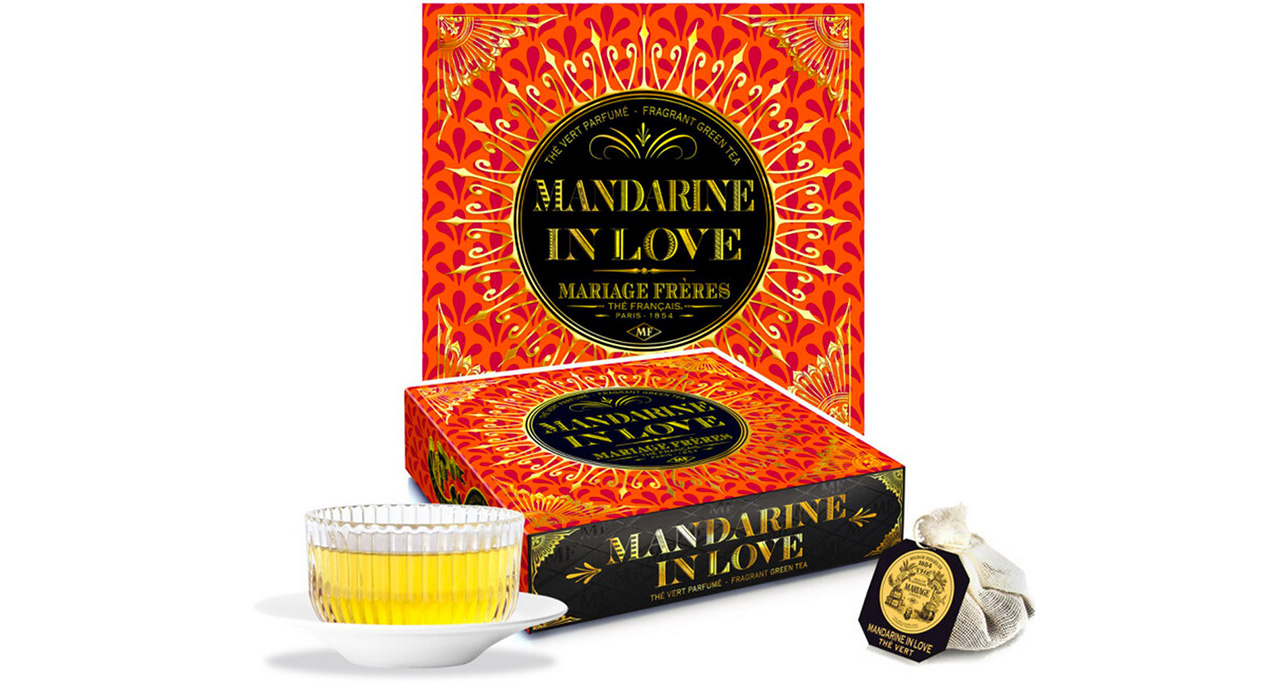 La merveilleuse rencontre entre la fraîcheur lumineuse de la mandarine et les notes élégantes des pétales de rose donnent vie au thé vert parfumé « Mandarine In Love », infiniment sensuel. La liqueur soyeuse est vive et succulente, arrondie par la douceur poudrée de notes florales. Ses saveurs subtiles glissent sur le palais comme des pétales fragiles portés par la brise. (25 euros)