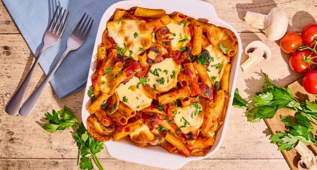 Recette de Rigatoni gratinés à la tomate, scamorza fumée et champignons