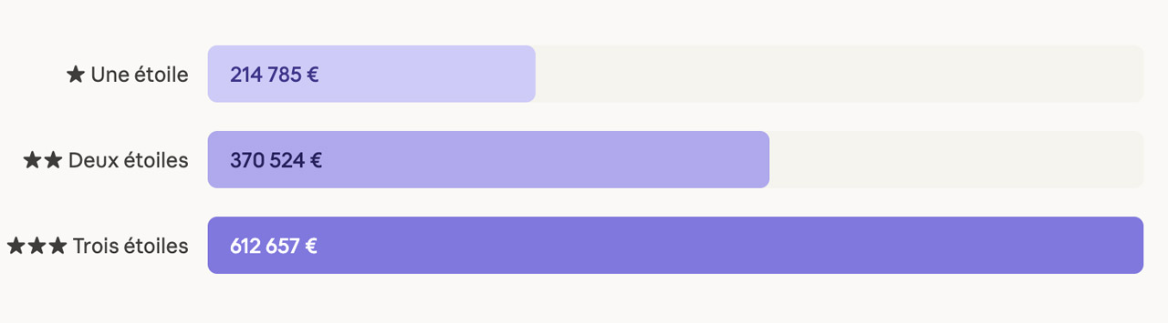 Les moyennes nationales, c’est bien. Mais c’est dans les données régionales que les choses deviennent vraiment intéressantes. Le Grand Est, par exemple, écrase tout le monde sur le segment une étoile avec 463 127 euros par établissement — plus du double de la moyenne nationale. En deux étoiles, le Centre-Val de Loire s’impose avec 765 065 Euros, talonné par l’Île-de-France. Et pour les trois étoiles, c’est l’Auvergne-Rhône-Alpes et la Nouvelle-Aquitaine qui mènent la danse, frôlant les 800 000 euros par établissement. Des régions portées par des maisons à forte notoriété, dont le rayonnement dépasse largement leurs frontières.