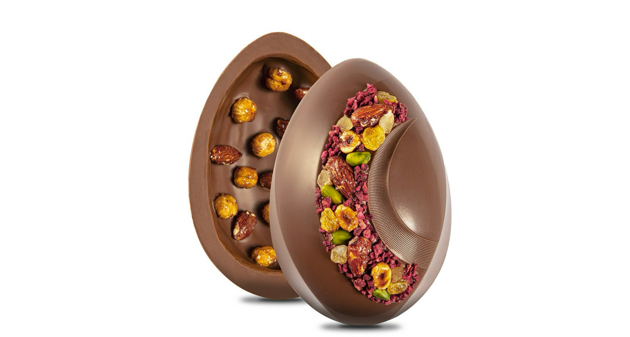 Ce joyau chocolaté, enrichi à la main avec des fruits secs caramélisés, offre une texture croquante et sucrée à chaque bouchée. La coquille cache une généreuse couche de praliné gros grain, créant une parfaite harmonie entre le croquant des fruits secs et la douceur veloutée du praliné. Une expérience gustative ! (41 euros)