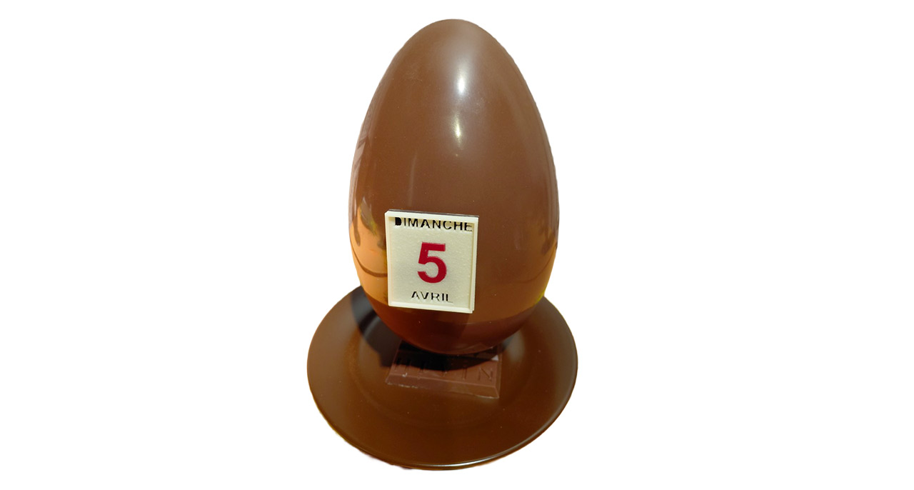 L’Oeuf « Du Jour » en chocolat noir Grand Cru du Cameroun Hévin-Nkolossang 70% est garni de sablés au chocolat noir, de fritures sèches et fourrées au chocolat noir. Dans sa collection 2026, « Des rêves et des fèves », l’artisan chocolatier (MOF) s’est amusé à lui mettre la date de la célébration pascale. Délicious ! (65 euros les 360g)