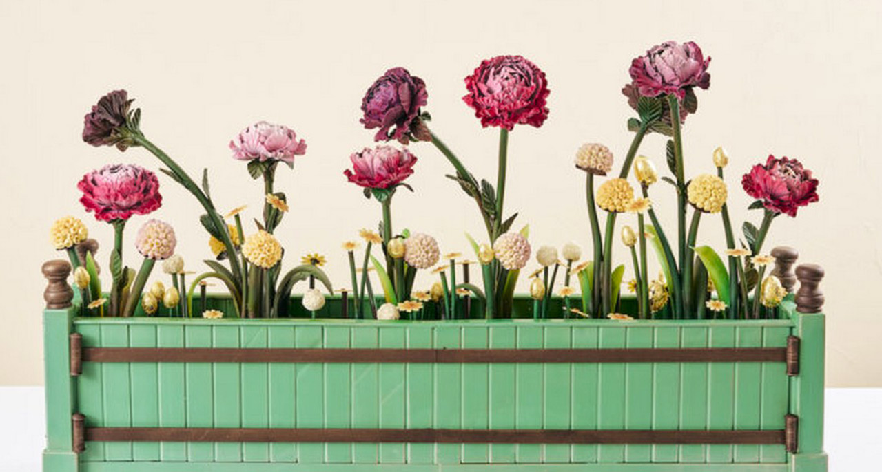 Une merveille florale inspirée des bacs en bois de l’Orangerie du château de Versailles. Pièce signature de la collection, « La Jardinière », où l’ensemble est composé de chocolat noir, lait et blanc avec quelques touches de feuille d’or. Cette pièce monumentale est à croquer avec poésie ! Disponible uniquement sur commande.