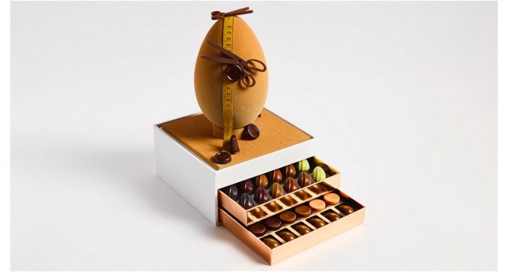 L’Œuf Haute Couture XL, réalisé en chocolat noir à partir de fèves d’Équateur et de São Tomé & Príncipe, se dresse tel une silhouette de défilé, majestueuse et parfaitement équilibrée. Posé sur un écrin à deux tiroirs renfermant une Malline d’œufs drapés. Une œuvre qui captive le regard autant que le palais. Superbe ! (185 euros)