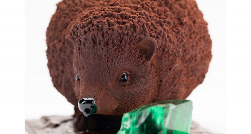 Le maestro s’est inspiré d’un souvenir de son enfance dans le Perche dont il avait vu dans son jardin un petit hérisson casser un œuf de poule et déguster l’intérieur. La coque est en chocolat noir de Madagascar 65% garni de fitures. Existe en plusieurs tailles. Une explosion de saveurs raffinée en bouche, trop bon et beau ! (75 euros les 190g)