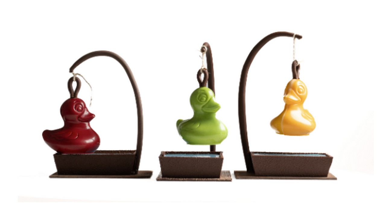 La Maison Chauvet présente sa pêche aux canards mettant à l’honneur l’un des symboles les plus marquants des souvenirs d’enfance. Sous leur coque chocolatée, les gourmands découvriront un praliné noisette fait maison, signature de la marque, associé à un cœur caramel. Une explosion gustative ! (29 euros les 250g)