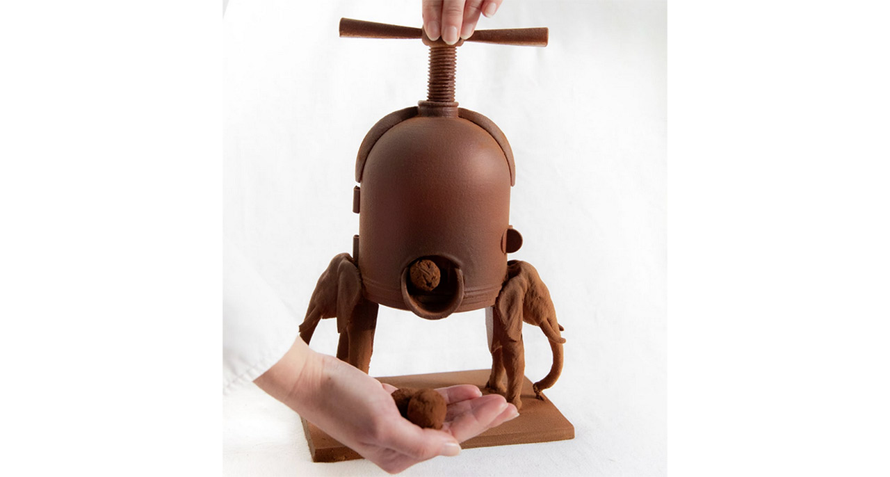 Le Chef pâtissier Quentin Lemmery a revisité la cloche de Pâques avec gourmandise de la presse à canard de Michel Guérard, « La Presse aux Merveilles » posée sur deux éléphants cariatides. Composé d’un chocolat noir praliné noisette accompagné de truffes fondantes au chocolat. Un petit chef d’oeuvre ! (85 euros)
