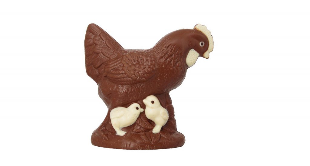 Voici Sidonie, la poule craquante au chocolat au lait bio avec ses deux poussins ! Décorée de touches de chocolat blanc, cette poule pleine de malice va charmer les petits enfants. La beauté de son moulage en fait une gourmandise incontournable de votre chasse aux oeufs pour un moment tant attendu ! (14,99 euros les 350g)